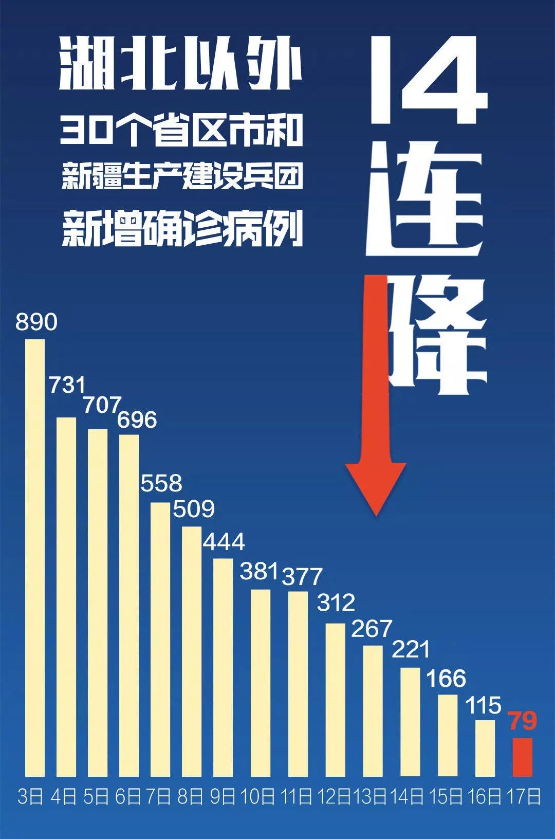 全國除湖北以外地區(qū)新增病例已實現(xiàn)14連降,從2月3日的890例下降到16日的115例。