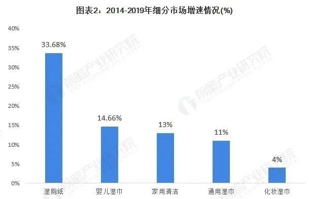隨著我國人民個人衛(wèi)生意識的不斷提高,人們對濕巾的需求越來越大,對濕巾品類和原料的要求也越來越高。因此濕巾品類不斷豐富,出現(xiàn)更多具有較強針對性的產(chǎn)品,比如濕廁紙、嬰兒用紙、廚房濕巾、卸妝濕巾等。目前我國市場中嬰兒濕巾仍占據(jù)主要市場份額,但濕廁紙增速迅猛,高達(dá)33.68%,有望趕超嬰兒濕巾。