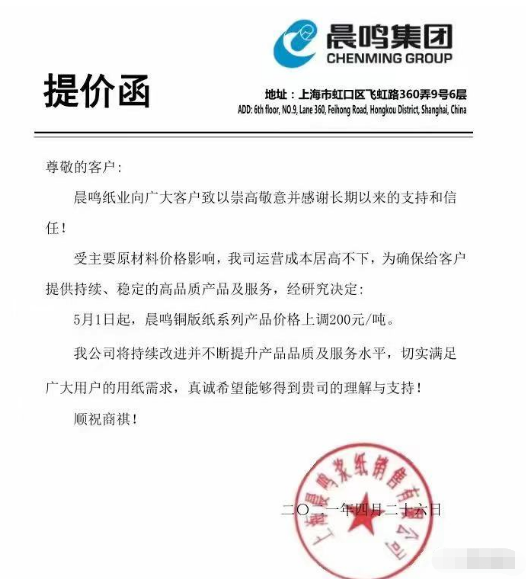 晨鳴紙業(yè):5月1日起,晨鳴銅版紙系列產(chǎn)品價(jià)格上調(diào)200元/噸。