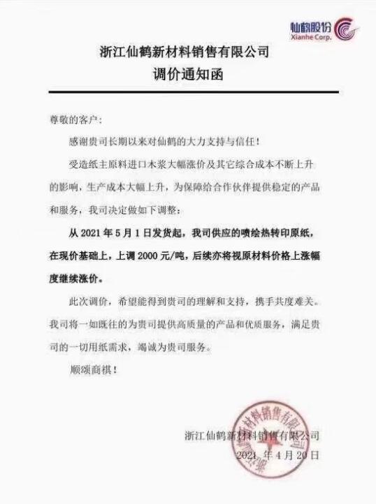 仙鶴新材料:5月1日發(fā)貨起,我司供應(yīng)的噴繪熱轉(zhuǎn)印原紙,在現(xiàn)價(jià)基礎(chǔ)上,上調(diào)2000元/噸,后續(xù)亦將視原材料價(jià)格上漲幅度繼續(xù)漲價(jià)。