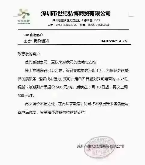 世紀(jì)弘博:即日起對(duì)我司經(jīng)營的白卡紙、銅版卡紙系列產(chǎn)品提價(jià)500元/噸。后續(xù)在5月10日起,再次上調(diào)500元/噸。