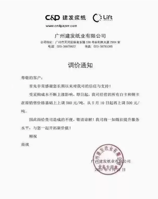 廈門國貿(mào)紙張華南區(qū):即日起,對(duì)我司經(jīng)營的全線白卡紙、銅版紙產(chǎn)品在原售價(jià)基礎(chǔ)上統(tǒng)一上調(diào)500元/噸。自5月10日起,再上調(diào)500元/噸。