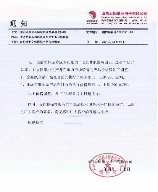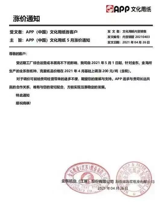 APP文化用紙:5月1日起,針對(duì)金東、金海所生產(chǎn)的各系各紙種、克重紙品價(jià)格在2021年4月基礎(chǔ)上調(diào)漲200元/噸(含稅)。