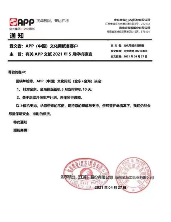 APP文化用紙:因鍋爐檢修,APP(中國)文化用紙(金東+金海)決定: