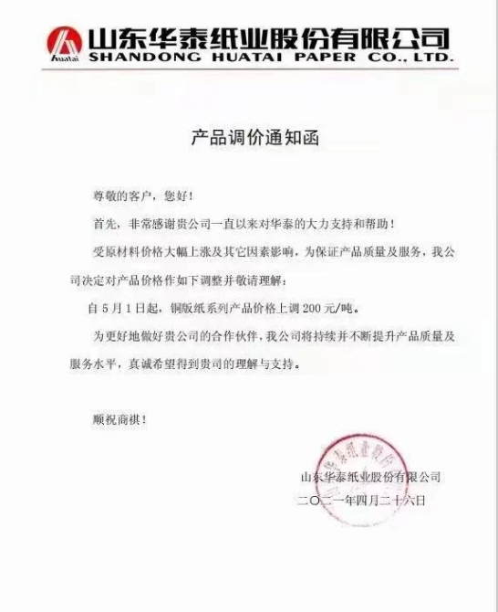 華泰紙業(yè):5月1日起,銅版紙系列產(chǎn)品價(jià)格上調(diào)200元/噸。