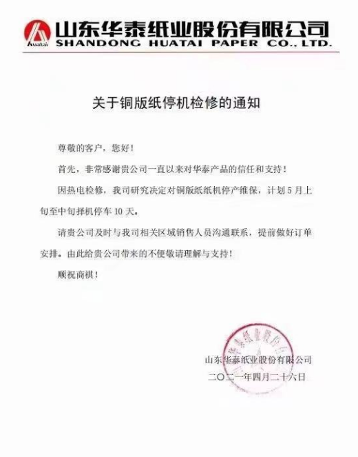 華泰紙業(yè):因熱點(diǎn)檢修,我司研究決定對(duì)銅版紙紙機(jī)停產(chǎn)維保,計(jì)劃5月上旬至中旬擇機(jī)停車10天。