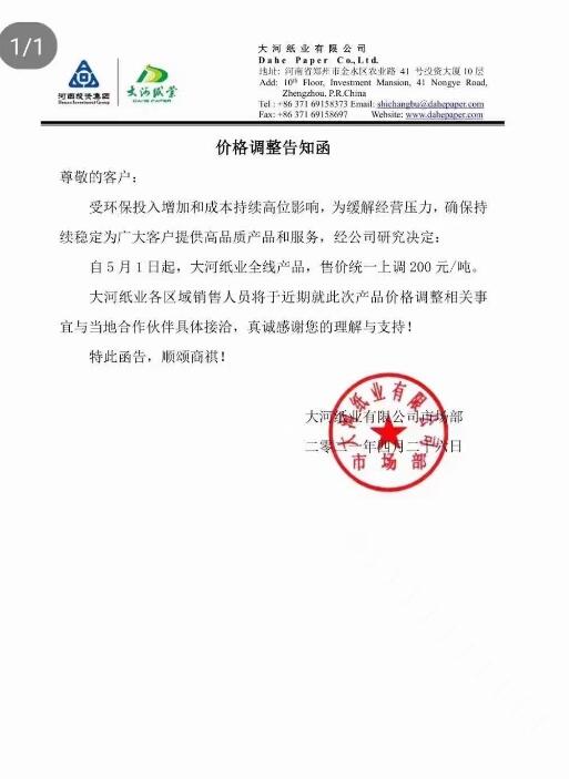 大河紙業(yè):5月1日起,大河紙業(yè)全線產(chǎn)品,售價(jià)統(tǒng)一上調(diào)200元/噸。