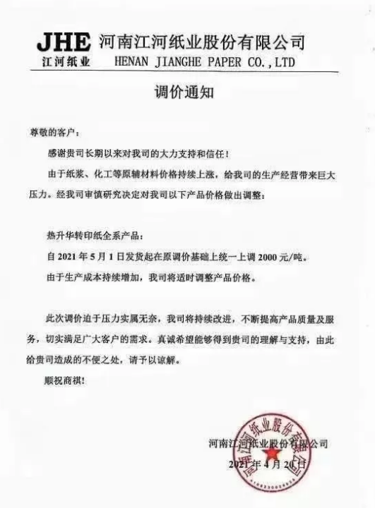 江河紙業(yè):5月1日起,熱升華轉(zhuǎn)印紙全系產(chǎn)品在原調(diào)價(jià)基礎(chǔ)上統(tǒng)一上調(diào)2000元/噸。