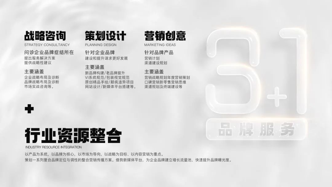 在一方品牌營銷管理堅(jiān)持以品牌思維引領(lǐng)生活快消品行業(yè),致力于讓每個(gè)品牌更有價(jià)值,讓每個(gè)項(xiàng)目落到實(shí)處。“3+1品牌服務(wù)理念”精心打造戰(zhàn)略咨詢、策劃設(shè)計(jì)及營銷創(chuàng)意三大核心板塊,加之整合行業(yè)產(chǎn)業(yè)鏈,以提供定制型全案服務(wù),驅(qū)動(dòng)品牌的市場價(jià)值,締造行業(yè)第一綜合型服務(wù)品牌!