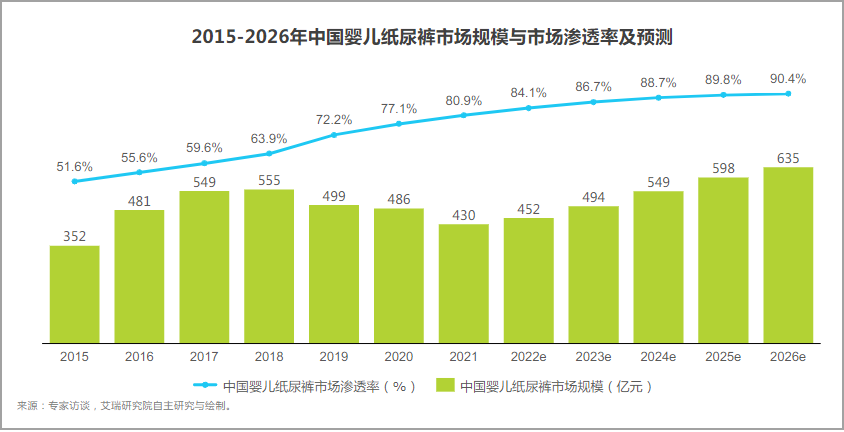 以嬰兒紙尿褲市場(chǎng)為例,該品類的市場(chǎng)滲透率從2015年的51.6%增加到2022年的84.1%,預(yù)計(jì)到2026將升至90.4%。