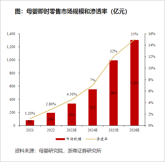年輕母嬰用戶對(duì)于“即時(shí)性”“便捷化”的追求,推動(dòng)母嬰即時(shí)零售渠道的狀態(tài),截止2022年該渠道規(guī)模約194億元,預(yù)計(jì)2026年將達(dá)1305億元,年復(fù)合增長74%,勢(shì)頭尤為猛烈。