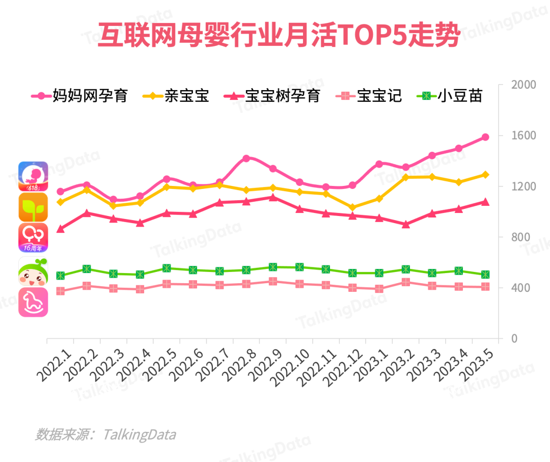 在行業(yè)Top 5平臺(tái)的2023年1-5月月活趨勢(shì)上,媽媽網(wǎng)孕育、親寶寶、寶寶樹孕育均表現(xiàn)出不同程度的增速??赡艿靡嬗谄淠笅胗脩羧后w的忠誠(chéng)度和能提供有價(jià)值的版塊/內(nèi)容,媽媽網(wǎng)孕育體現(xiàn)出更為顯著的優(yōu)勢(shì)。