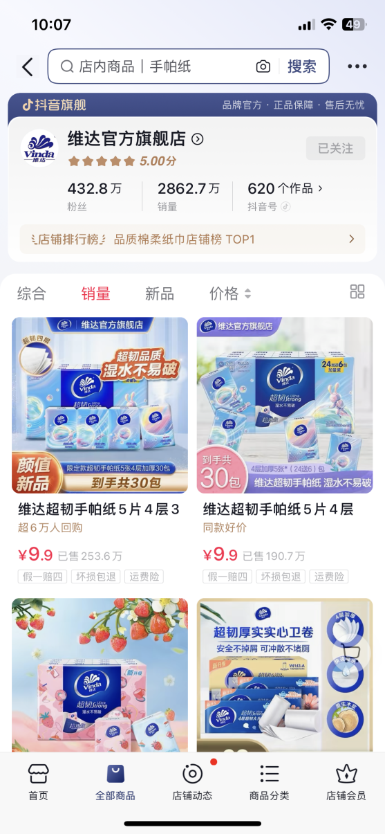 其中以抖音電商為例,維達(dá)在抖音設(shè)立的旗艦店已經(jīng)擁有粉絲432.8萬,累計(jì)獲贊138.5萬,并發(fā)布了620個(gè)推廣作品,對(duì)應(yīng)上架商品多達(dá)579件。