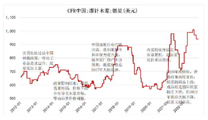 然而,針對(duì)木漿這一原材料,生活用紙企業(yè)非常被動(dòng)。據(jù)方正中期期貨數(shù)據(jù)顯示,我們可以在下表的漂針木漿(銀星)CFR現(xiàn)貨價(jià)走勢中發(fā)現(xiàn),從2012年到2022年,木漿價(jià)格整體攀升幅度非常大,同時(shí)波動(dòng)明顯。直到2022年,木漿現(xiàn)貨價(jià)格達(dá)到歷史高位。由此可見,生活用紙企業(yè)在囤積原材料方面壓力不小。
