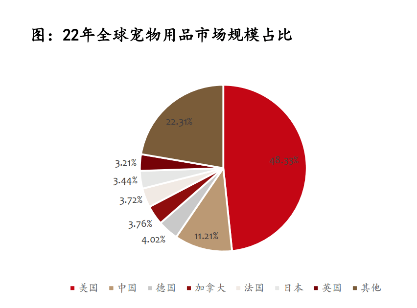 從國家層面來看,目前美國寵物用品市場規(guī)模排名第一,2022年美國寵物用品市場規(guī)模高達(dá)230.04億美元,占全球市場份額的48.33%。中國寵物用品市場規(guī)模僅次于美國,2022年市場規(guī)模為53.45億美元,占全球市場份額的11.21%;英國、德國、日本、法國、加拿大也是重要的寵物用品消費(fèi)市場,根據(jù)歐睿國際的數(shù)據(jù),22年德、加、法、日、英的寵物用品的市場份額分別為4.02%、3.76%、3.72%、3.44%、3.21%。