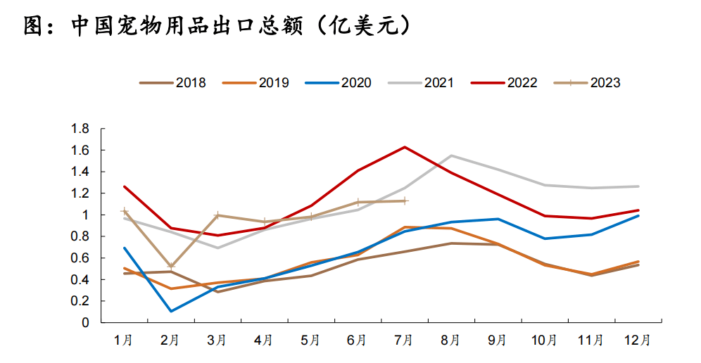從寵物用品出口數(shù)據(jù)來看,目前我國寵物用品出口正在從底部回暖。2023年7月中國寵物用品以美元口徑計(jì)算出口總額為1.13億美元,同比減少30.64%,環(huán)比增長1.13%。