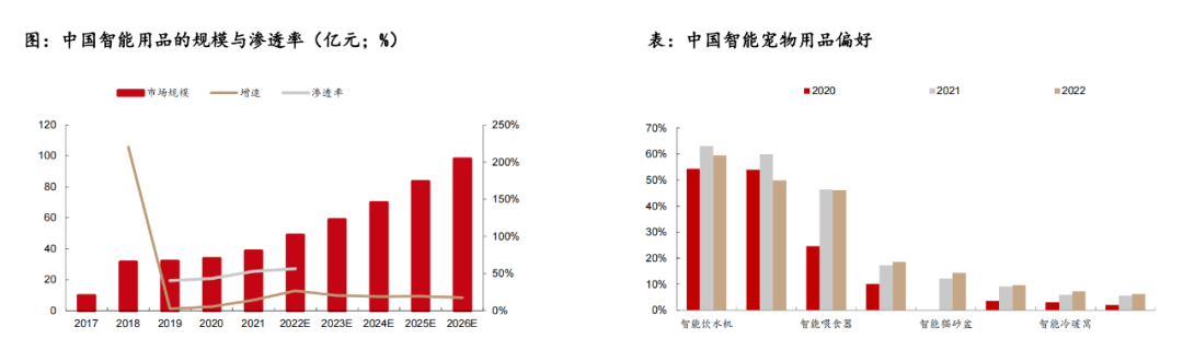 一是智能化:數(shù)據(jù)顯示,2017-2021年中國寵物用品市場規(guī)模分別為9.8、31.4、32.1、33.8、38.6億元,2017-2019年CAGR高達(dá)40.9%,預(yù)計(jì)到2026年,寵物智能用品有望達(dá)到98.1億元。