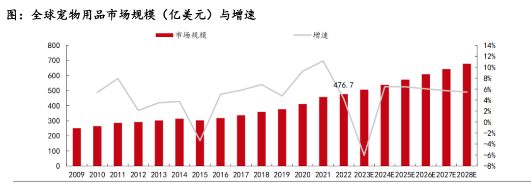 根據(jù)歐睿國際數(shù)據(jù)顯示,2019-2021年寵物用品市場增速分別為4.76%、9.28%、11.16%。2022年增速有所放緩,僅為4.28%,全球?qū)櫸镉闷芬?guī)模達(dá)477.68億美元,2019-2022年復(fù)合增長率為8.20%,預(yù)計(jì)2022-2028年寵物用品復(fù)合年均增長率為3.03%,寵物用品市場規(guī)模將達(dá)到677.25億美元。